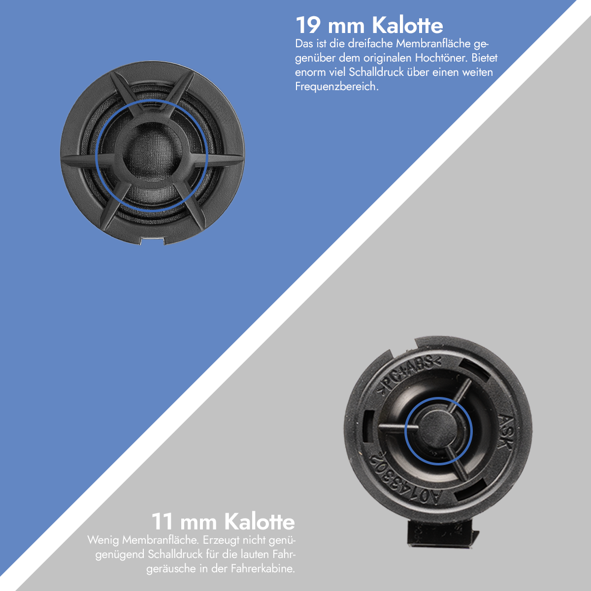 Aufgrund der Kalottengrösse von 19 mm kann der Axton Hochtöner deutlich lauter spielen und sich gegen die Fahrgeräusche durchsetzen. Der Frequenzbereich ist ebenfalls breiter und die Ankopplung an den Tieftöner findet bereits bei ca. 6 kHz statt, was die Räumlichkeit und Präzision der Musikwiedergabe stark verbessert.