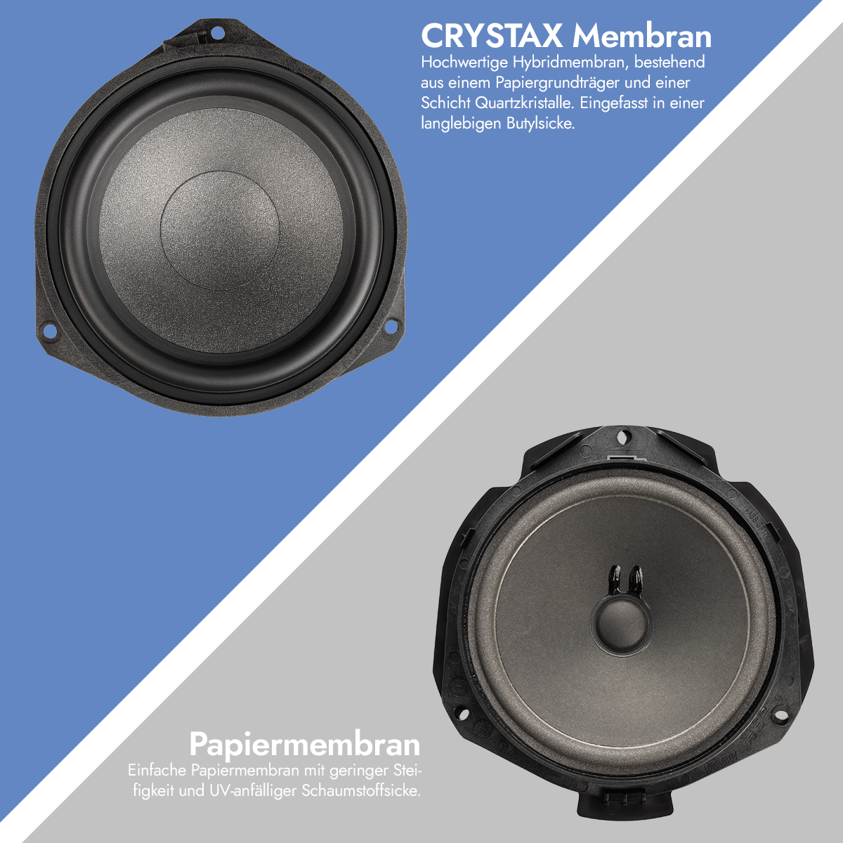 Die Axton Crystax Membran ist zwar mit 0.48 mm nicht merklich dicker, aber durch ihr hyperbolisches NAWI-Design deutlich stabiler und reduziert die Teilschwingungen markant – wodurch eine Wiedergabe bis 8 kHz ermöglicht wird. Die harten Quarzkristalle auf der Oberseite der Axton Membran „stubsen“ die Luftmoleküle zudem deutlich härter an, als die weichen Papierfasern der Oberfläche der Fiat Membran und erzielen dadurch eine deutlich präzisere Musikwiedergabe.
