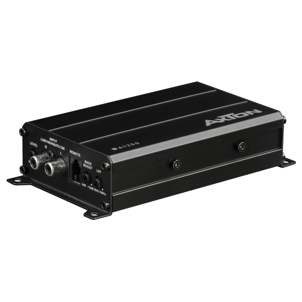 Der AXTON digital Verstärker verfügt über ein integriertes 12 dB/Okt. Tiefpassfilter, stufenlos regelbar von 35 – 500 Hz, sowie eine Bass Boost Funktion @ 50 Hz (0 – 12 dB). Dazu kommen ein Cinch-Eingang sowie ein High-Level Eingang mit Auto-Turn-On zum Anschluss des A1250 an Werksradios ohne Cinchausgang – damit lässt sich der Verstärker einfach mit werkseitig installierten Radios kombinieren. Eine Basspegelfernbedienung ist ebenfalls im Lieferumfang enthalten.