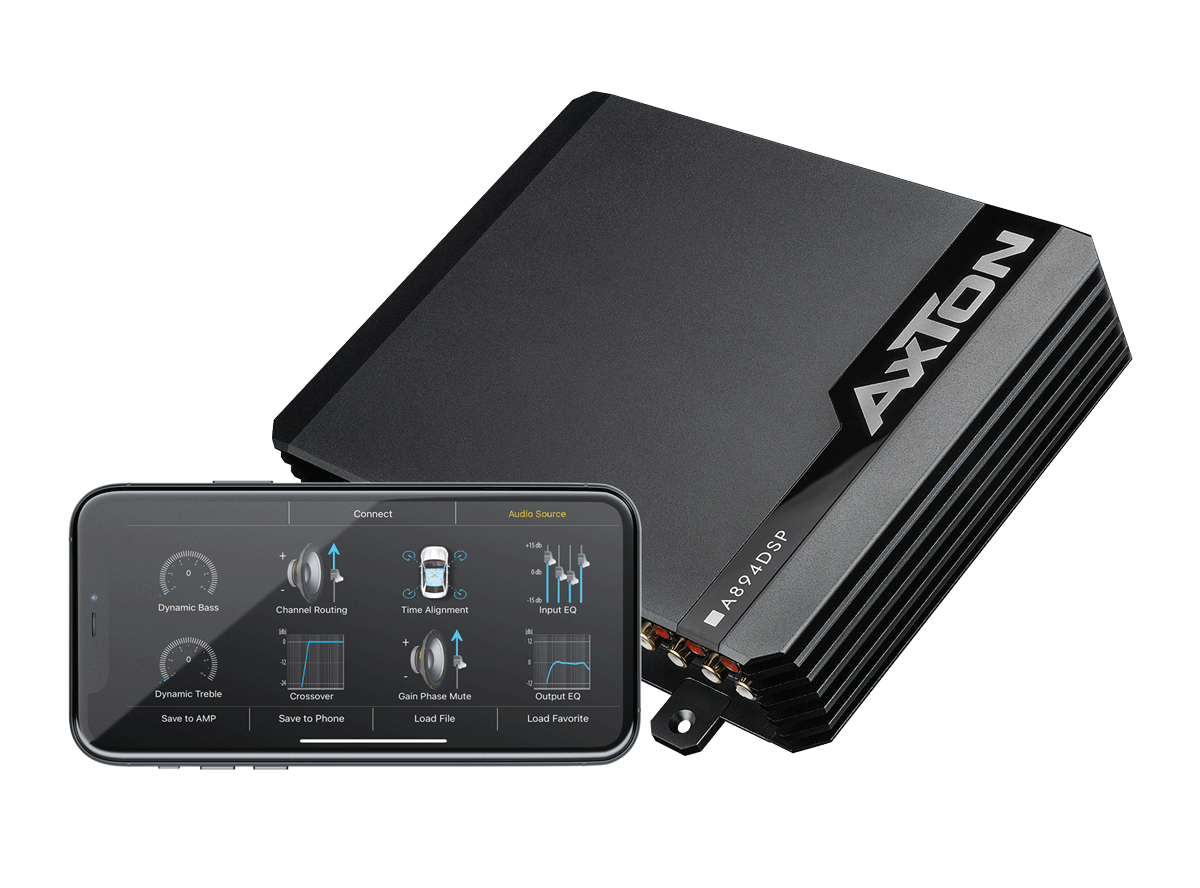 Der integrierte DSP bietet pro Kanal umfangreiche Einstellungen wie Laufzeitkorrektur, variable Frequenzfilter, Gain-Regler und einen 31-Band EQ. In der App sind fahrzeugspezifische Setups für die Plug & Play Kabel hinterlegt. Über Bluetooth lässt sich Musik direkt auf den Verstärker streamen; mit dem optionalen ABT50 Interface ist auch Hi-Res Audio möglich. Dank optischer Ein- und Ausgänge können mehrere AXTON DSP Verstärker verlustfrei gekoppelt werden.